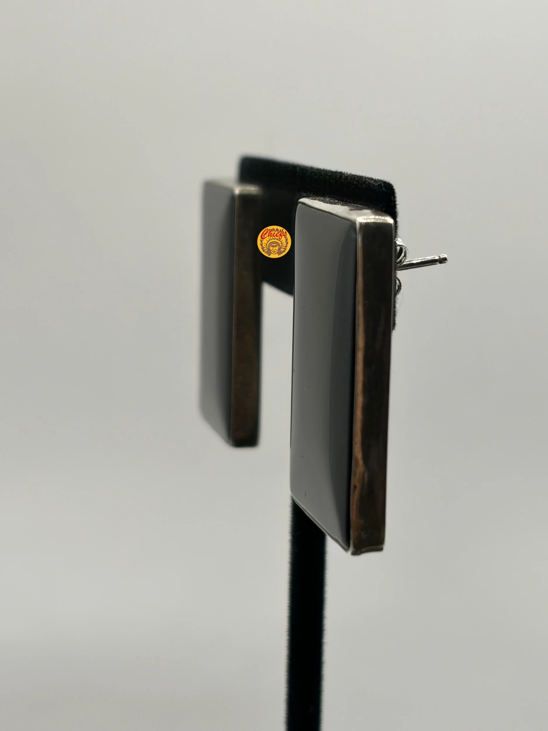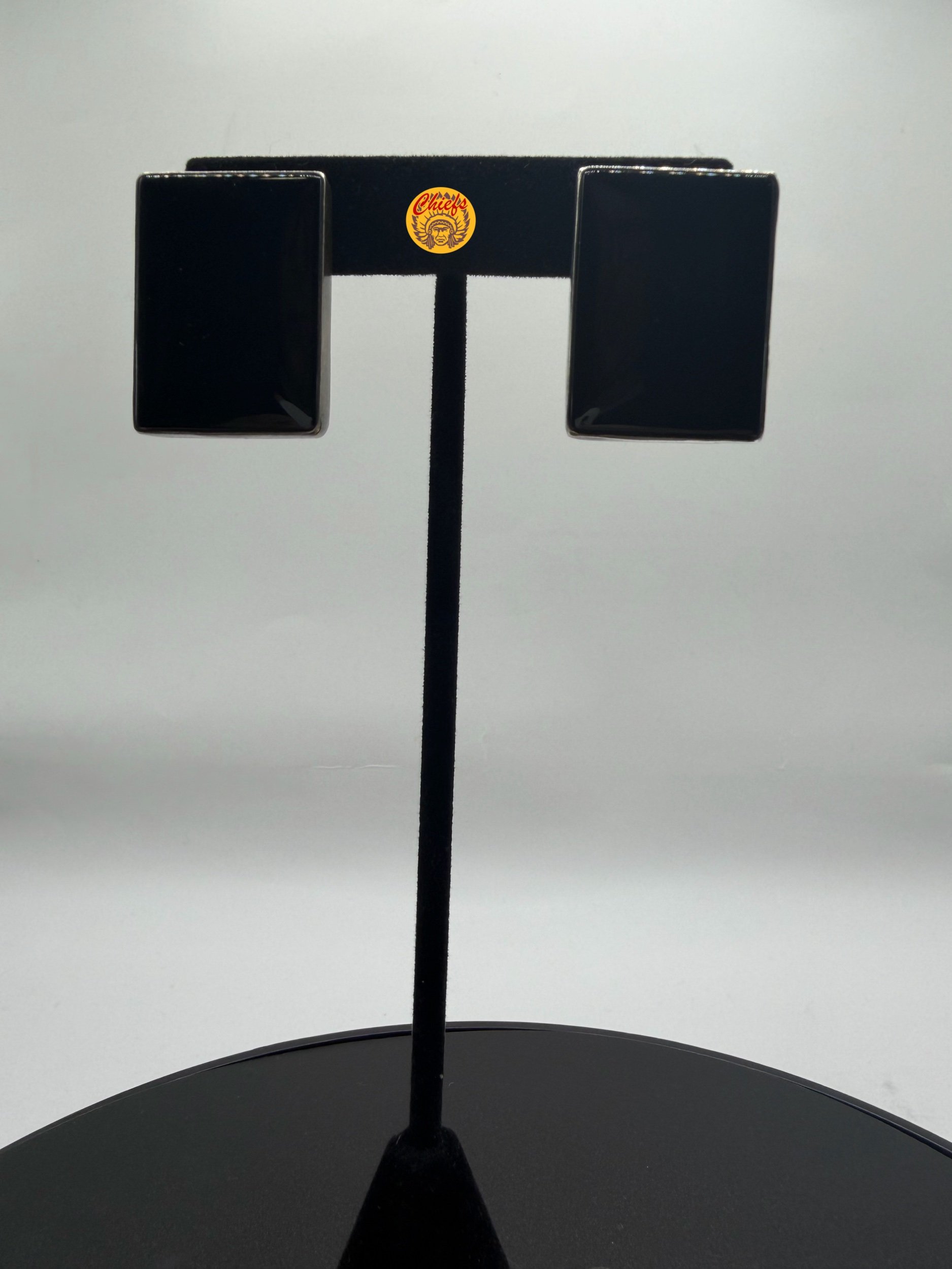 A bold pair of black onyx studs featuring sleek, rectangular stones set in sterling silver. The deep, glossy black onyx creates a striking contrast, giving these earrings a clean, modern edge while still feeling timeless.