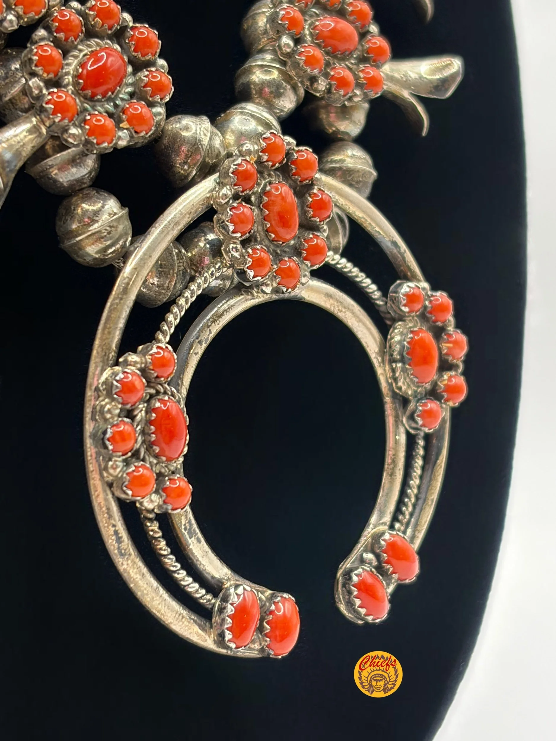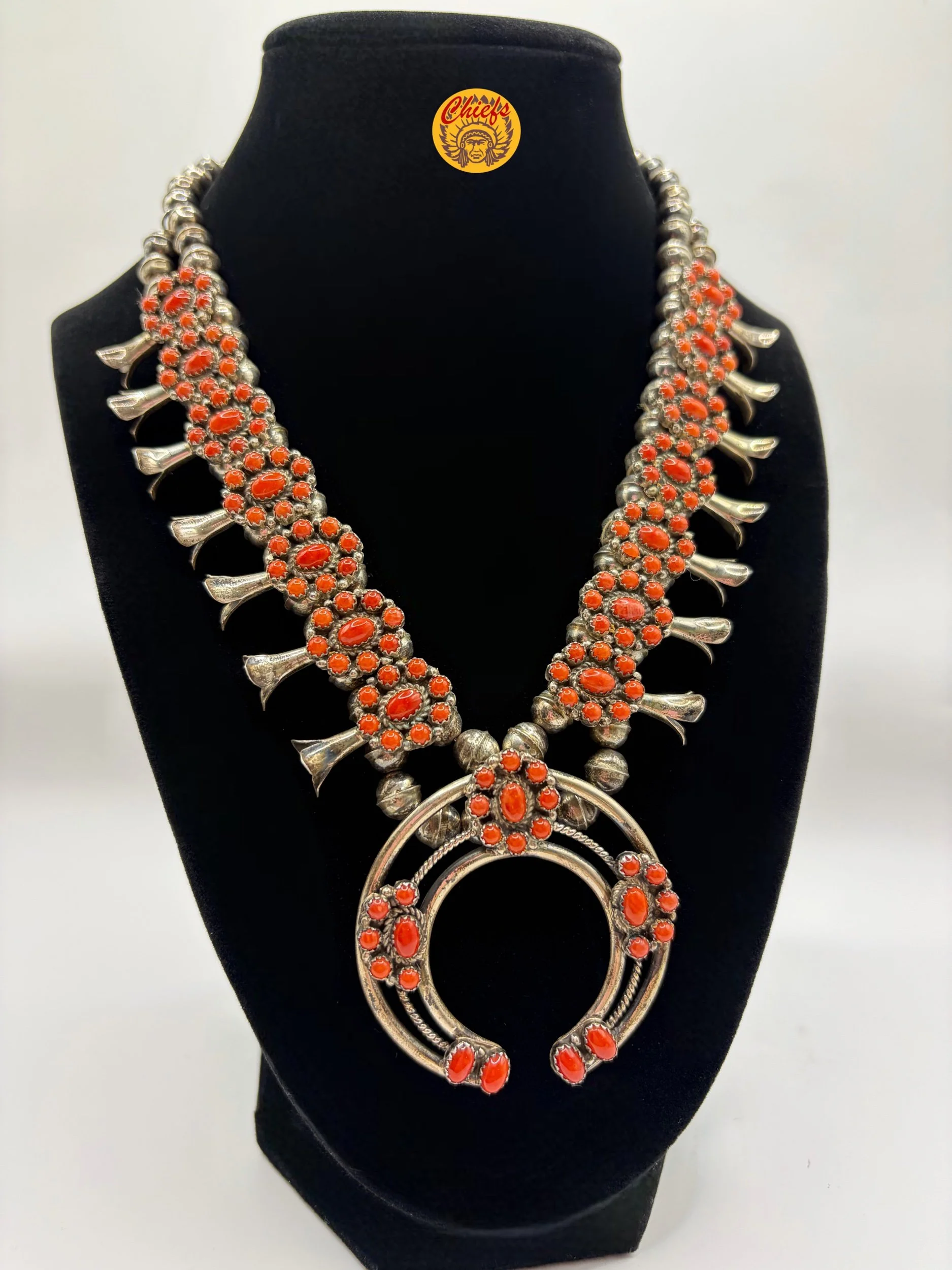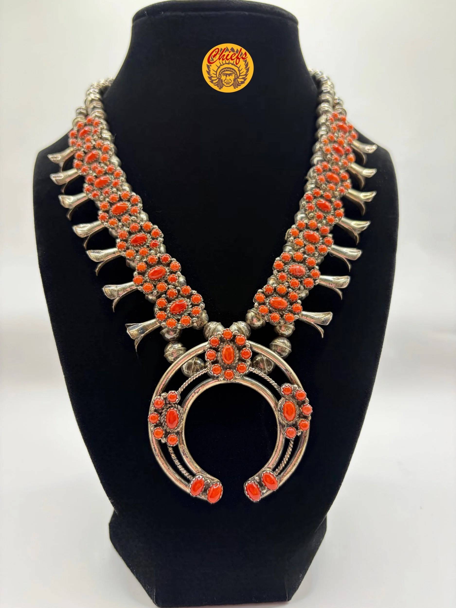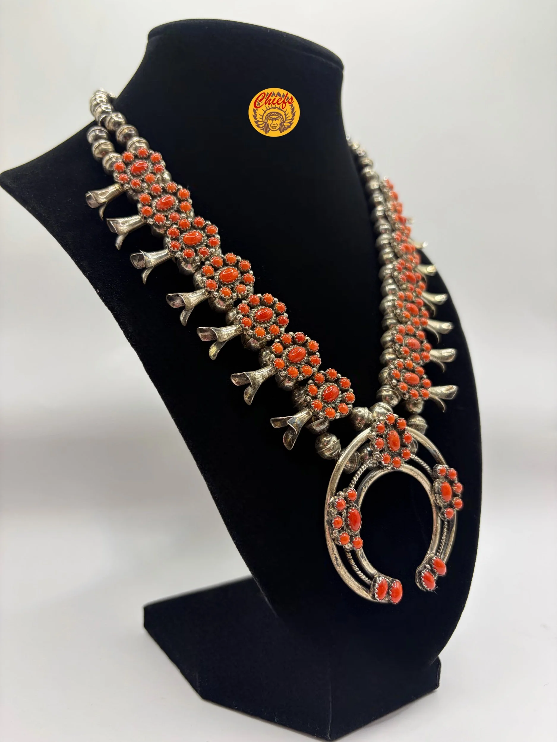 This stunning coral squash blossom necklace features 14 beautifully crafted blossoms, each set with vibrant coral stones in intricate cluster designs that create rich texture and dimension throughout the piece.