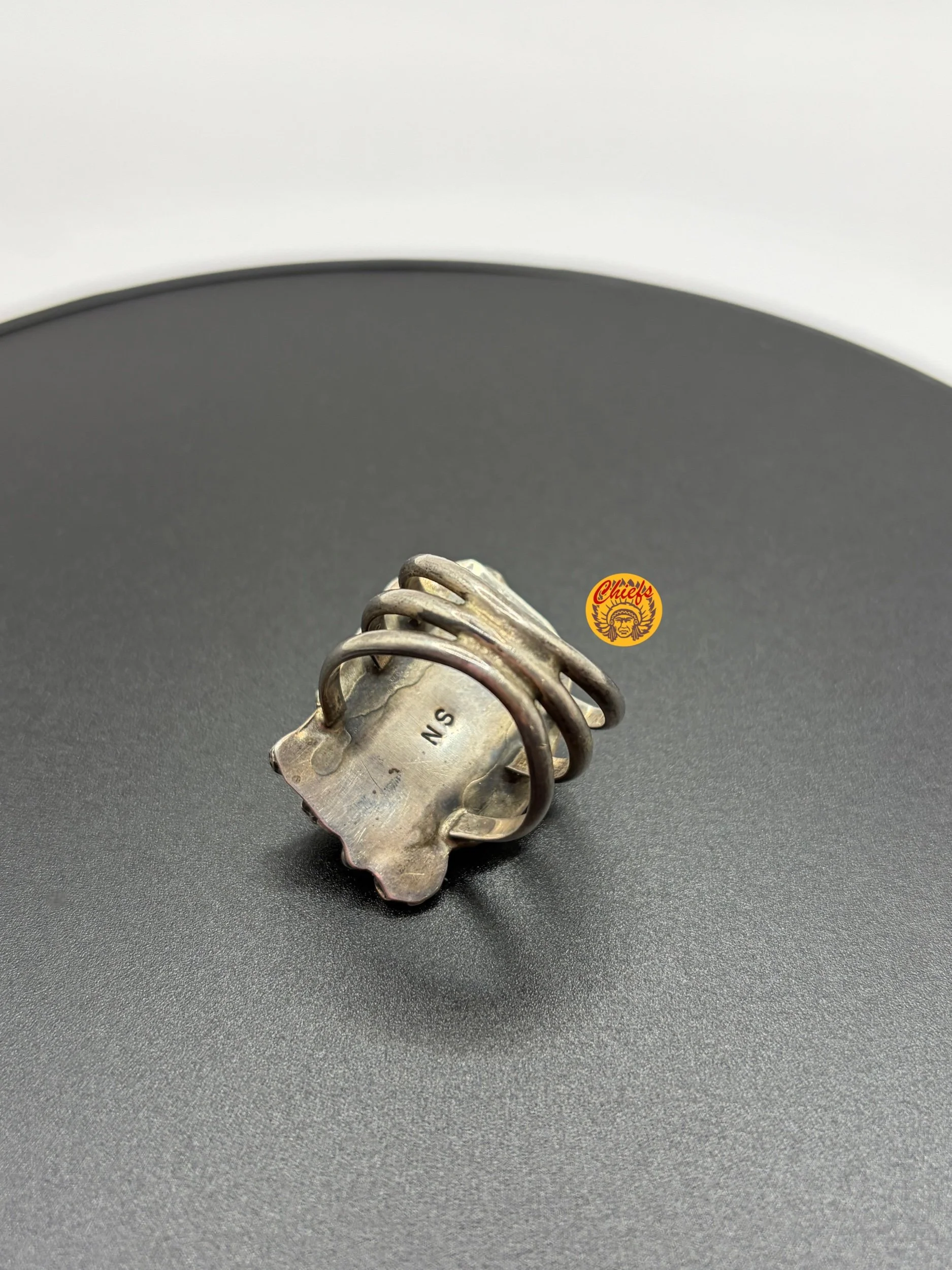 Set in sterling silver, the stone is framed with detailed silverwork, including leaf and bead accents that add dimension and character. The bold setting and natural matrix make this piece truly one of a kind.