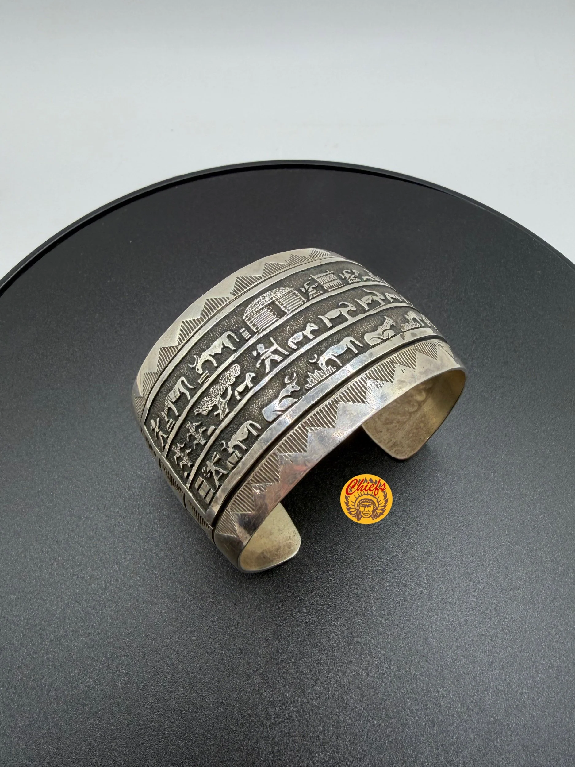 This striking storyteller cuff features intricately stamped scenes that wrap beautifully around the wrist, each detail capturing a moment of tradition and life. The design showcases narrative imagery; figures, animals, and structures- symbolizing heritage, storytelling, and the passing down of culture through generations.