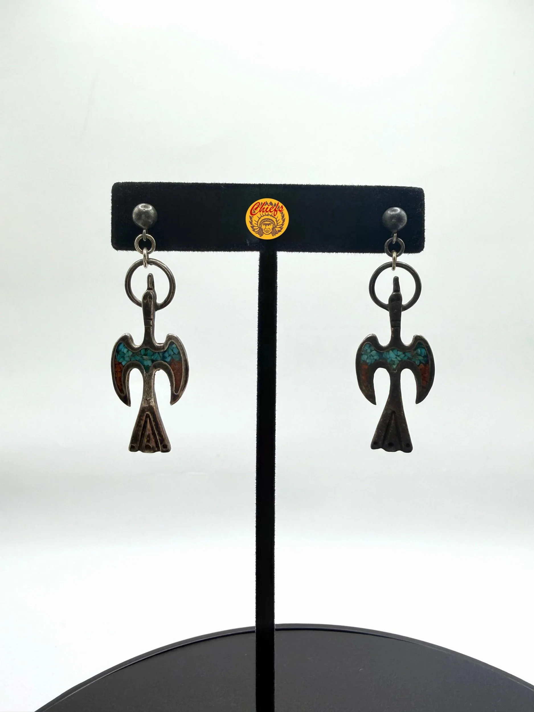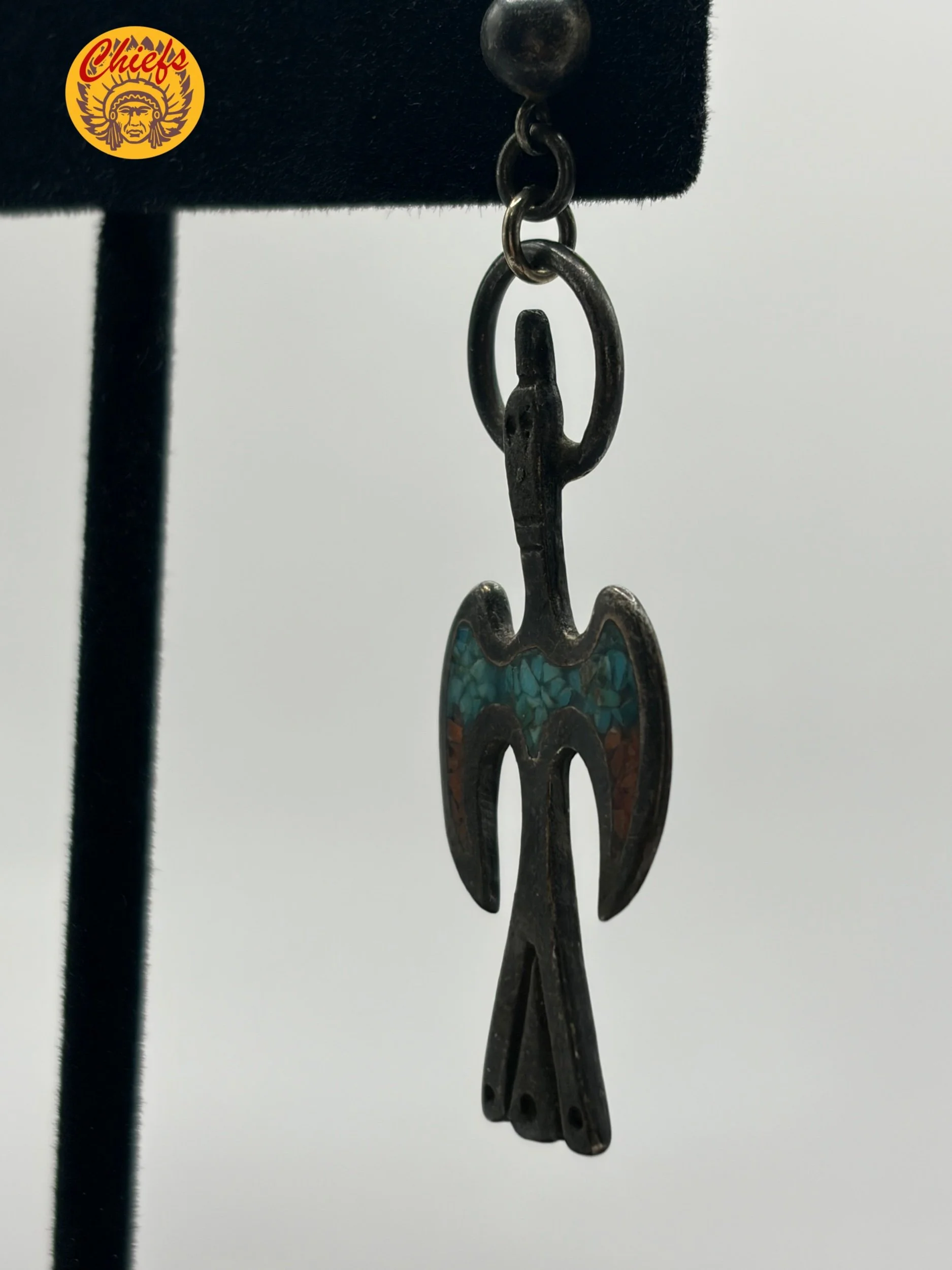 A bold pair of Thunderbird earrings featuring vibrant turquoise inlay set in darkened sterling silver. The iconic thunderbird design symbolizes strength, protection, and power, making these earrings both meaningful and eye-catching.