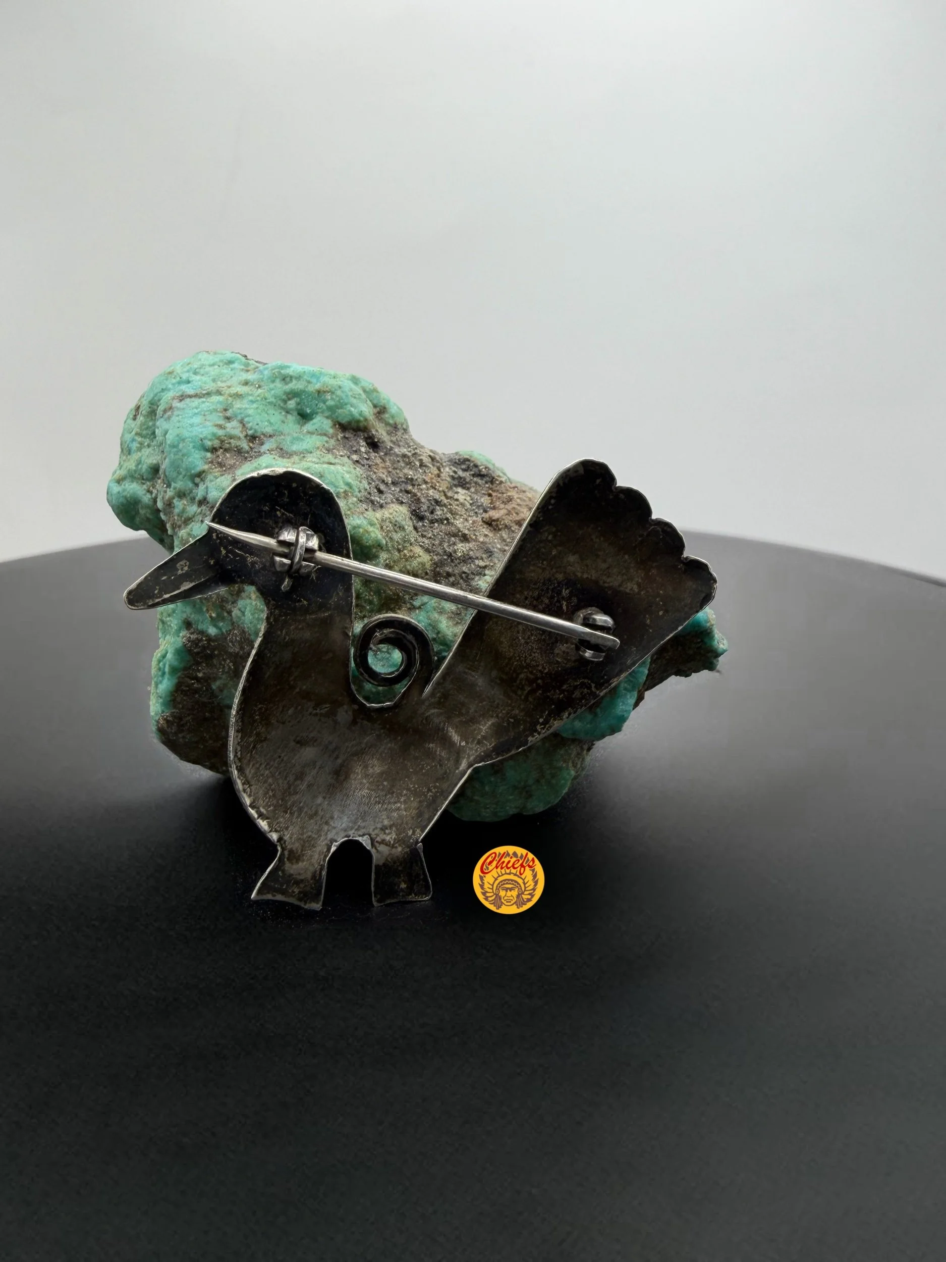 A charming sterling silver bird brooch featuring a single turquoise stone set as the eye, bringing a subtle pop of color to this handcrafted piece. The detailed wing work and stamped accents give it a playful yet timeless character.