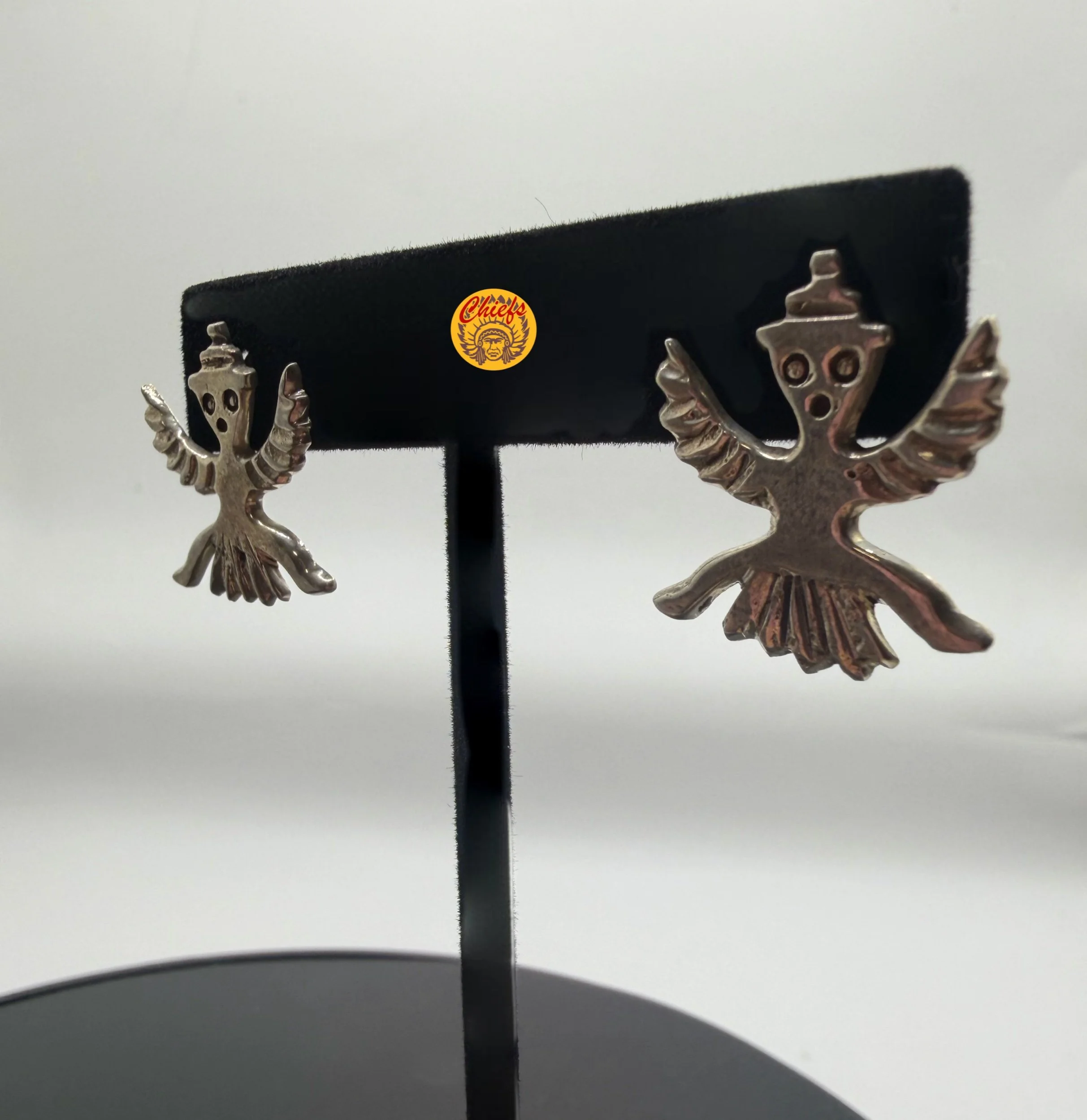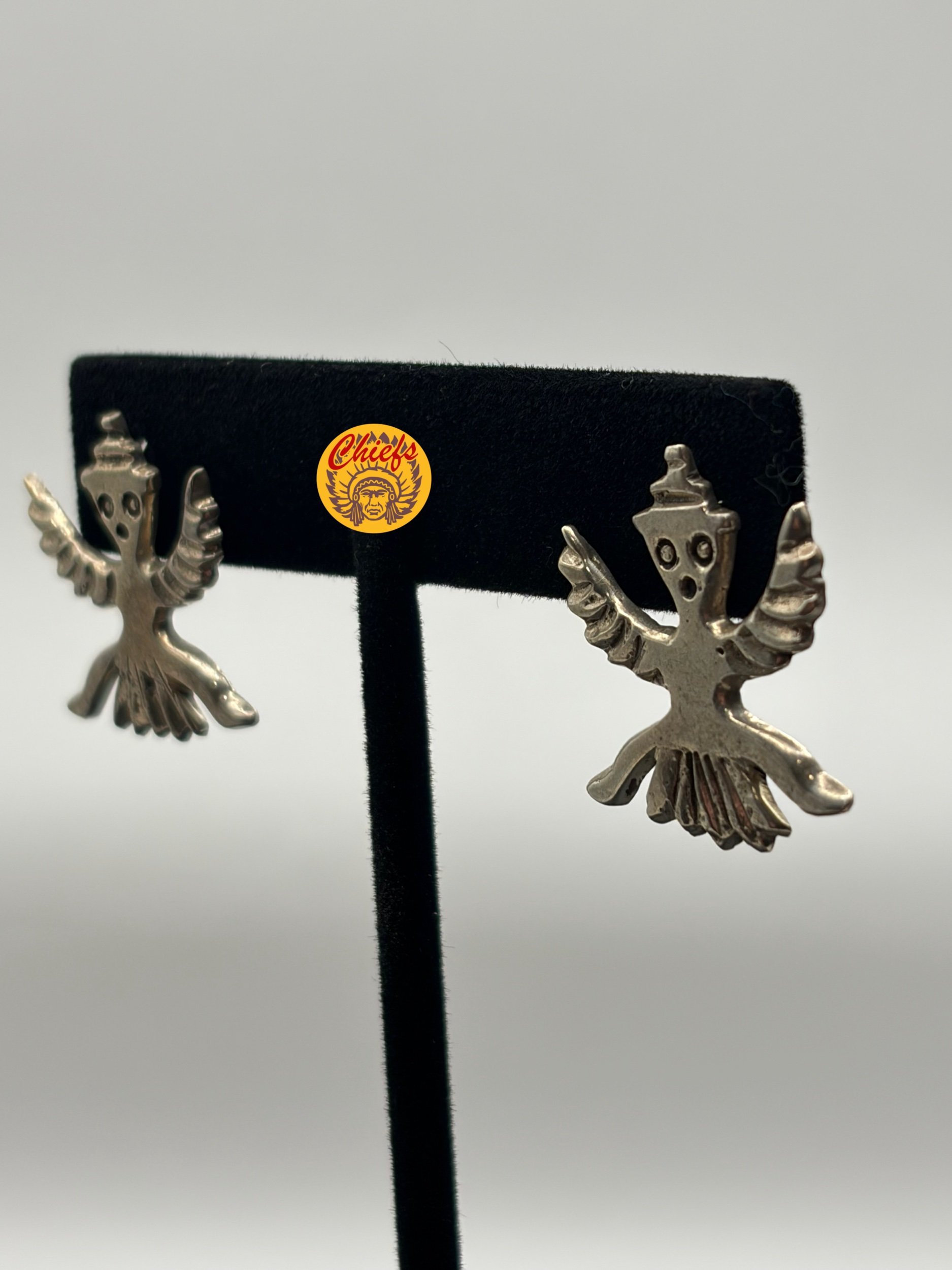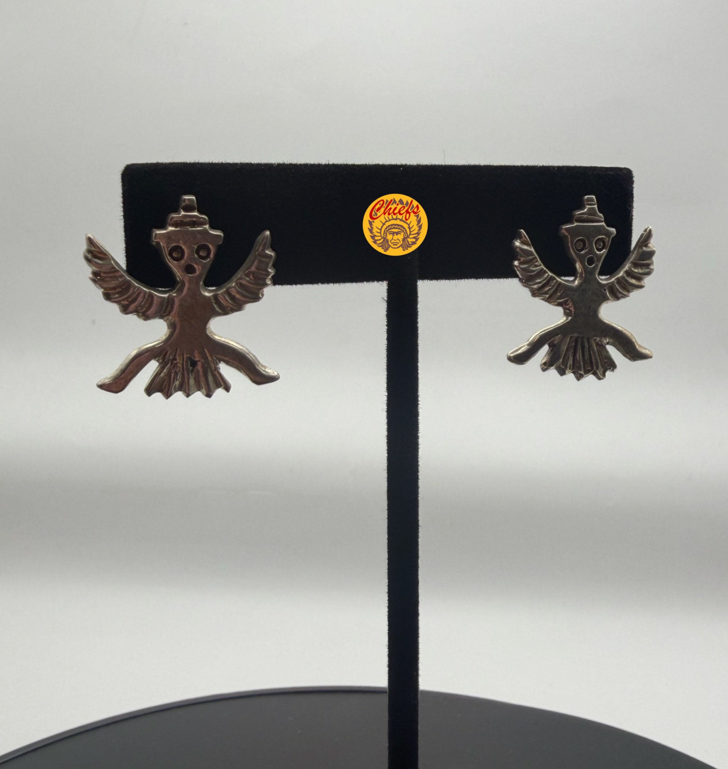 Sterling silver earrings featuring the iconic Knifewing figure, a powerful symbol in Zuni tradition. Depicted as half-man, half-eagle warrior, the Knifewing represents protection, strength, and courage.